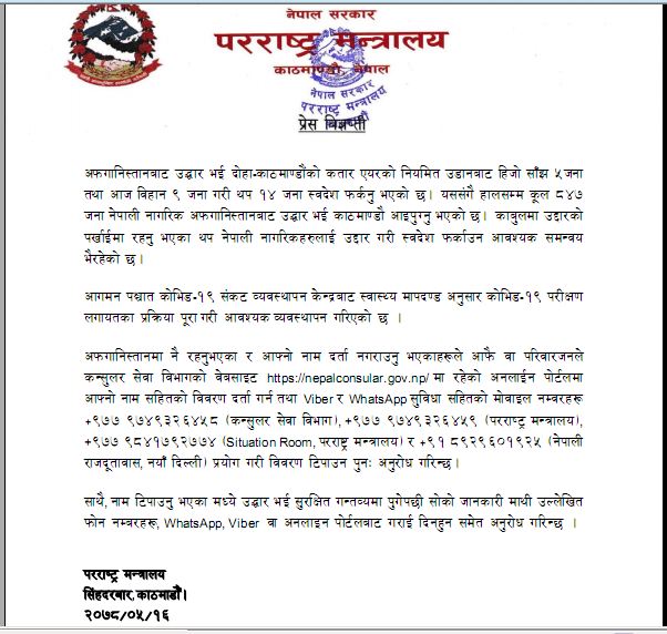 अफगानिस्तानमा नै रहेका र आफ्नो नाम दर्ता नगराएका आफंै वा परिवारजनले कन्सुलर सेवा विभागको वेबसाइटमा रहेको अनलाईन पोर्टलमा आफ्नो नामसहितको विवरण दर्ता गर्न तथा भाईवर, ह्वाट्सएप सुविधासहितको मोबाइल नम्बरहरू +९७७ ९७४९३२६४५८ (कन्सुलर सेवा विभाग), +९७७ ९७४९३२६४५९ (परराष्ट्रन मन्त्रालय), +९७७ ९८४१७९२७७४ परराष्ट्र मन्त्रालय) र+९१ ८९२९६०१९२५ (नेपाली राजदूतावास, नयाँ दिल्ली) प्रयोग गरी विवरण टिपाउन पुनः अनुरोध गरेको छ ।