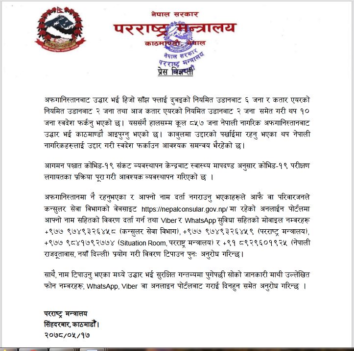 योसँगै हालसम्म कुल आठ सय ५७ जना नेपाली नागरिक अफगानिस्तानबाट उद्धार भई काठमाडौ आइपुगेका छन् । काबुलमा उद्धारको पर्खाईमा रहेका थप नेपाली नागरिकहरुलाई उद्दार गरी स्वदेश फर्काउन आवश्यक समन्वय भैरहेको मन्त्रालयले जनाएको छ ।