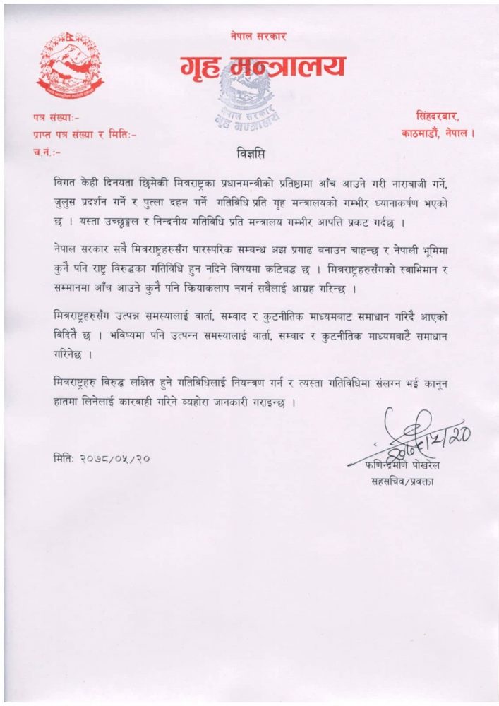 “विगत केही दिनयता छिमेकी मित्रराष्ट्रका प्रधानमन्त्रीको प्रतिष्ठामा आँच आउने गरी नाराबाजी गर्ने, जुलुस प्रदर्शन गर्ने र पुत्ला दहन गर्ने गतिविधिप्रति गृह मन्त्रालयको गम्भीर ध्यानाकर्षण भएको छ,” गृह मन्त्रालयका प्रवक्ता फणिन्द्रमणि पोखरलेले जारी गरेको विज्ञप्तिमा भनिएको छ, “नेपाल सरकार सबै मित्र मित्रराष्ट्रहरुसँग पारस्परिक सम्बन्ध अझ प्रगाढ बनाउन चाहन्छ र नेपाली भूमिमा कुनै पनि राष्ट्र विरुद्धका गतिविधि हुन नदिने विषयमा कटिबद्ध छ।”