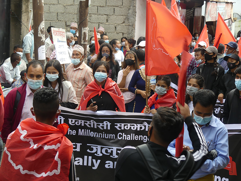 प्रदर्शनकारीले ‘सम्पूर्ण देशभक्त जनता एक होऔं’, ‘एमसीसीका मतिहारु होसियार’, ‘अमेरिकी एसियालाई युद्धभूमि बनाउन दिँदैनौं’ लगायत नारा लेखिएका प्लेकार्डहरु बोकेका थिए ।
