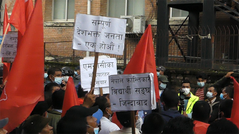 दूतावासअगाडि शान्तिपूर्ण प्रदर्शन गर्दा प्रहरीले हस्तक्षेप गरेपछि आक्रोश प्रदर्शनकारी टिचिङ अस्पतालको पछाडि गल्लीमा पुगेर नाराबाजी गरेका थिए । उनीहरुले ‘देउवा सरकार होसियार’, ‘एमसीसी खारेज गर’, ‘प्रहरी दमन मुर्दावाद’, ‘एमसीसीका मतिहारु होसियार’ लगायतका नारा लगाएका थिए ।