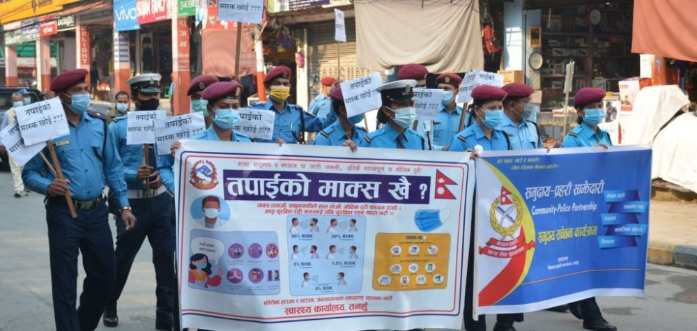 नयाँ भेरियन्टसहितको कोभिड–१९ को संक्रमण बढ्दै गएको सन्दर्भमा यसबाट सिर्जना हुन सक्ने समस्या र चुनौतीलाई दृष्टिगत गरी संक्रमण रोक्न तोकिएको सुरक्षा मापदण्डलाई दुरुस्त रुपमा कार्यान्वयनका लागि नेपाल प्रहरीले ‘संक्रमणबाट आफू बचौँ र अरुलाई पनि बचाऔँ’ भन्ने नारासहित ‘तपाईंको मास्क खै ?’ लगायतका विभिन्न सचेतनामूलक कार्यक्रमलाई अभियानकै रुपमा सञ्चालन गरिरहेको छ ।