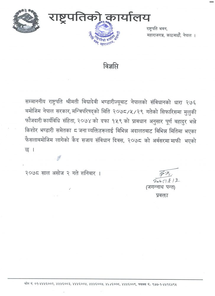 संविधानको धारा २७६ बमोजिम मन्त्रिपरिषद्को भदौ २९ गतेको सिफारिसमा मुलुकी फौजदारी कार्यविधि संहित २०७४ को दफा १५९ को प्रावधान अनुसार पूर्ण बहादुर भन्ने किशोर भण्डारी समेतका ८ जना व्यक्तिहरुलाई विभिन्न अदालतबाट विभिन्न मितिमा गरिएकाे फैसला बमोजिम माफी भएको हो ।