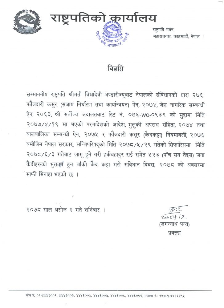 शनिवार राष्ट्रपति कार्यालयले एक विज्ञप्ति जारी गर्दै संविधान दिवसका अवसरमा राष्ट्रपति विद्यादेवी भण्डारीले ८ जनाको कैद सजाय माफी र ५२३ जनाको कैद कट्टा गर्ने छन् । गएको भदौ २९ गतेको मन्त्रिपरिषद् बैठकले असोज ३ गते संविधान दिवसको अवसर पारेर कैद माफी र कैद कट्टाका लागि राष्ट्रपतिसमक्ष सिफारिस गरेको थियो ।
