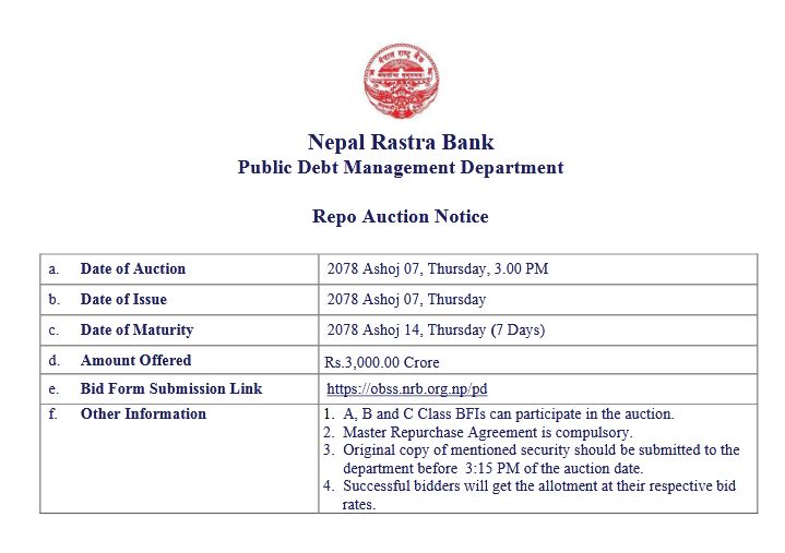रिपो खरिदका लागि वाणिज्य बैंक, विकास बैंक र फाईनान्स कम्पनीहरुले भोलि दिउँसो ३ बजेसम्म आवेदन दिन सक्नेछन् । रिपोको परिपक्व हुुने अवधि भने सात दिन अर्थात यही असोज १४ गते तोकिएको छ ।