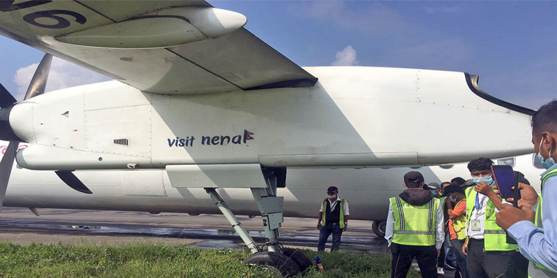 नाइननानफ कल साइन भएको क्यू४००–८ जहाज काठमाडौंबाट नेपालगञ्जका लागि बिहान ९ः३३ मा उडान भर्ने क्रममा धावनमार्गमा ट्याक्सी गर्ने क्रममा पार्किङ क्षेत्रमै एउटा चक्का घाँसे मैदानमा फस्न पुगेको विमानस्थलका महाप्रबन्धक प्रतापबाबु तिवारीले जानकारी दिए ।