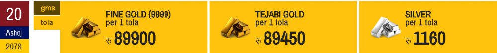 अघिल्लो दिन सुन ९० हजार ३ सयमा कारोबार भएको थियो । त्यस्तै महासंघका अनुसार आज तेजाबी सुनको मूल्य पनि ४०० ले नै घटेको छ । आज तेजावी सुन ८९ हजार ४ सय ५० रुपैयाँमा कारोबार भइरहेको छ । हिजो तेजाबी सुन ८९ हजार ८ सय ५० रुपैयाँमा कारोबार भएको थियो ।