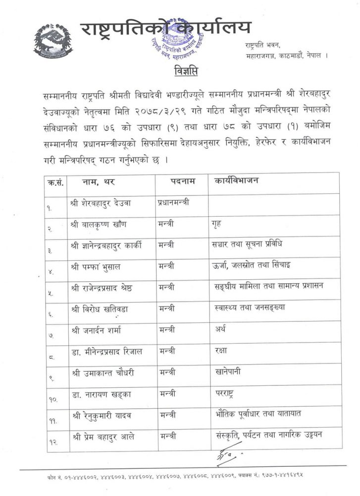 काठमाडौं । सरकार गठन भएको ३ महिनापछि प्रधानमन्त्री शेरबहादुर देउवाले मन्त्रिपरिषद्लाई पूर्णता दिएका छन् । प्रधानमन्त्री देउवाको सिफारिसमा राष्ट्रपति विद्यादेवी भण्डारीले १६ मन्त्री र दुई राज्यमन्त्री नियुक्त गरेकी हुन् ।