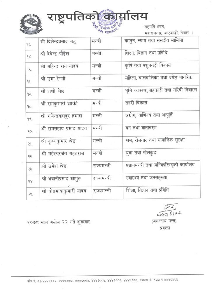 त्यस्तै स्वास्थ्य राज्यमन्त्री उमेश श्रेष्ठ प्रधानमन्त्री तथा मन्त्रिपरिषद कार्यालयमा सारिएका छन् । नवनियुक्त मन्त्रीहरुको सपथ ग्रहण आजै हुने भएको छ । साढे ४ बजे सपथकाे समय ताेकिएकाे छ ।