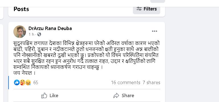 सामाजिक संजालमा उनले लेखेकि छन्- ‘सुदूरपश्चिमलगायत देशका विभिन्न क्षेत्रहरुमा परेको अविरल वर्षाका कारण भएको बाढी, पहिरो, डुबान र नदीकटानले ठूलो धनजनको क्षती हुनुका साथै अन्न बालीको पनि नोक्सानीको खबरले दुखी भएको छु। प्रकोपको यो विषम परिस्थितिमा संयमित भएर सबै सुरक्षित रहन हुन अनुरोध गर्दै तत्काल राहत, उद्दार र क्षतिपुर्तिको लागि सम्वन्धित निकायको ध्यानाकर्षण गराउन चाहन्छु ।’ जय नेपाल ।