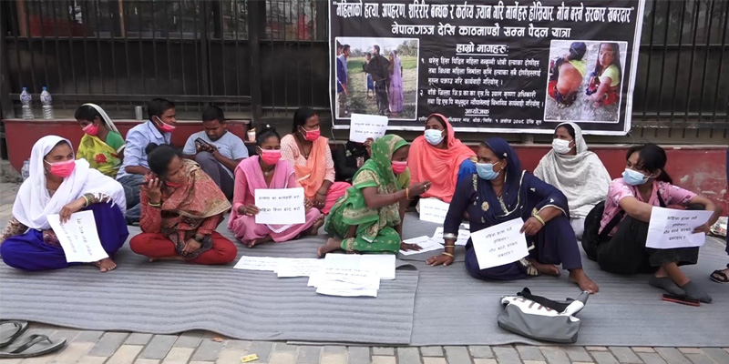 पीडितको न्यायका लागि भन्दै नेपालगञ्जदेखि २० दिनको यात्रा गरेर काठमाडौं आइपुगेका १५ जना पीडित परिवारका सदस्य तथा महिला अधिकारकर्मीहरुले माइतीघरमा धर्ना दिएका उनीहरुलाई मंगलवार माइतीघरमा महिला आयोग र मुस्लिम आयोगका अध्यक्षहरुले भेट गरेका हुन् ।