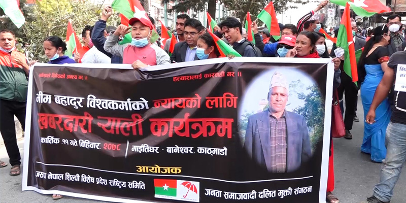 काठमाडौं । चितवनका भीमबहादुर विश्वकर्माको हत्याको विरुद्धमा काठमाडौंको माइतिघरमा विरोध प्रदर्शन गरिएको छ । जसपा नेपाल शिल्पी विशेष प्रदेश राष्ट्रिय समिति र जनता समाजवादी दलित मुक्ति संगठनको संयुक्त आयोजनामा भीमबहादुर विश्वकर्माको न्यायको लागि माइतिघरमा बिहीवार खबरदारी र्याली गरिएको हो ।