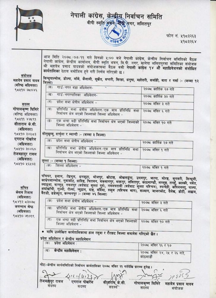 निर्वाचन समितिले बुधबार भने मंसिर २७ देखि २९ सम्म महाधिवेशन गर्ने मिति प्रस्ताव गरेको थियो । तर बिहीबार बसेको समितिको बैठकले मंसिर २४ देखि २६ गतेसम्म महाधिवेशन गर्ने कार्यतालिका बनाएको समितिका संयोजक महादेव यादवले जानकारी दिए ।