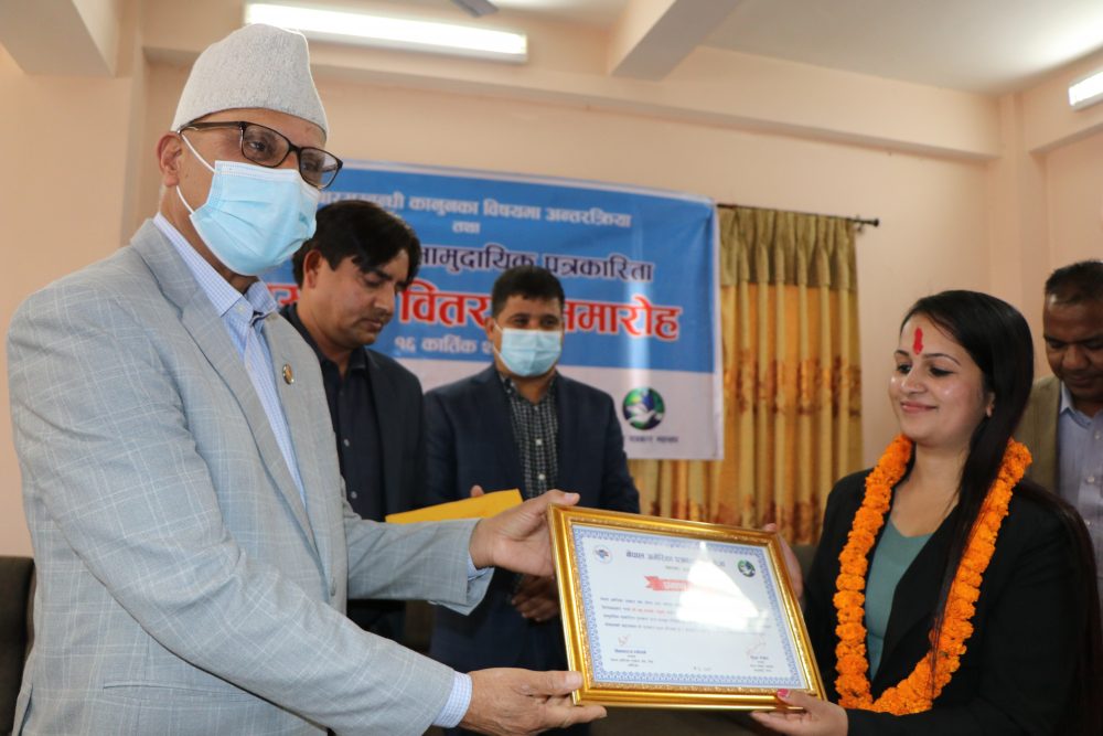 ‘नेजा ग्रामीण सामुदायिक पत्रकारिता पुरस्कार’बाट सम्मानित पत्रकार आचार्यलाई दुई लाख २२ हजार दुईसय २२ रुपैयाँ र प्रमाणपत्रबाट सम्मानित गरिएको छ ।