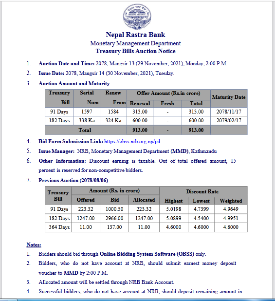 जारी मिति भने मंसिर १४ गते तोकिएको ट्रेजरी खरिदको लागि वाणिज्य बैंक, विकास बैंक र फाइनान्स कम्पनीहरुले भाग लिन पाउनेछन् । बिक्री गरिने कुुल ट्रेजरी मध्ये ९१ दिने अवधिको तीन अर्ब १३ करोड र एक सय ८२ दिने अवधिको छ अर्ब रुपैंयाँको रहेको छ ।