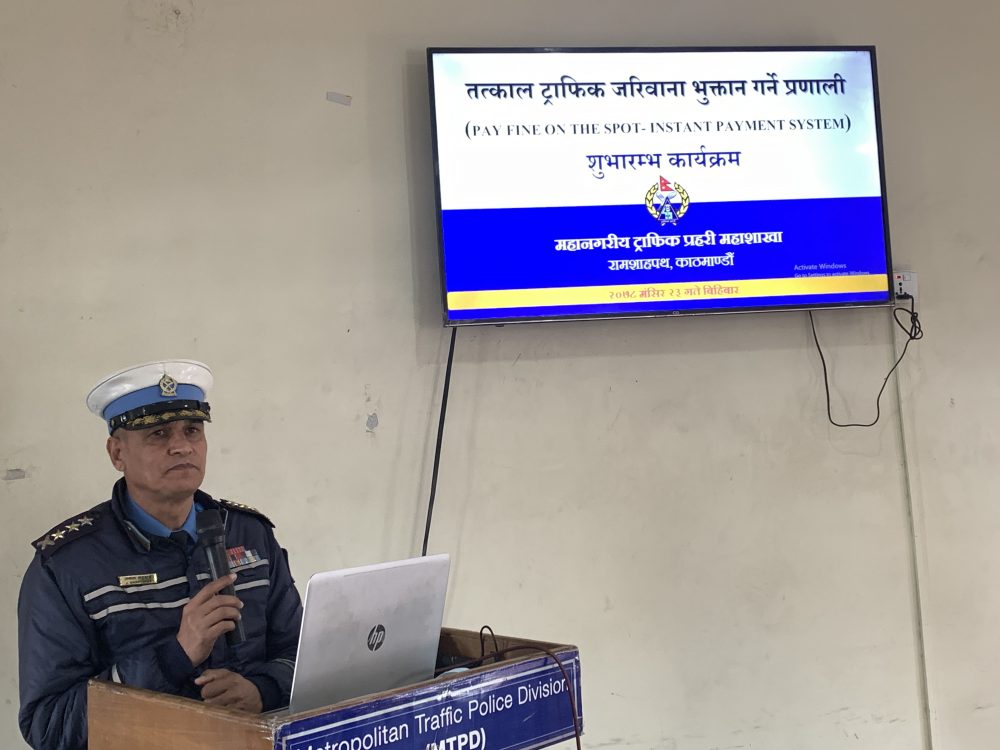 महानगरीय ट्राफिक प्रहरी महाशाखाका प्रमुख प्रहरी वरिष्ठ उपरीक्षक जनक भट्टराईले आज एक कार्यक्रमका वीच प्रविधिमा आधारित ‘पे फाइन अन द स्पोर्ट – इन्स्ट्यान्ट पेमेन्ट सिस्टम’ व्यवस्थाको सुरुवात गरेका हुन् ।