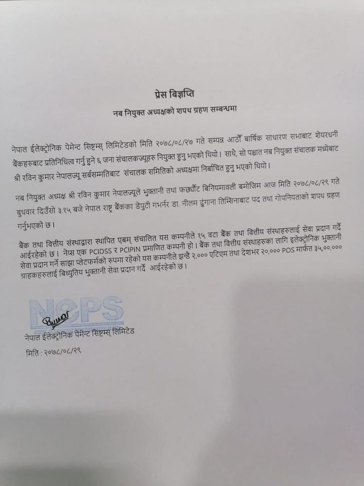 ईलेक्ट्रोनिक पेमेन्ट सिष्टम्स् लिमिटेडको सोमबार सम्पन्न वार्षिक साधारण सभाबाट सेयरधनी बैंकहरुबाट प्रतिनिधित्व गर्ने ६ संचालकहरु नियुक्त भएका थिए । जसमध्येबाट नेपाललाई संचालक समितिको अध्यक्षमा निर्वाचित गरिएको हो ।