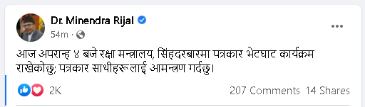 उनले लेखेका छन्, ‘आज अपराह्न ४ बजे सिंहदरबारमा पत्रकार भेटघाट कार्यक्रम राखेको छु, पत्रकार साथीहरूलाई आमन्त्रण गर्छु ।’
