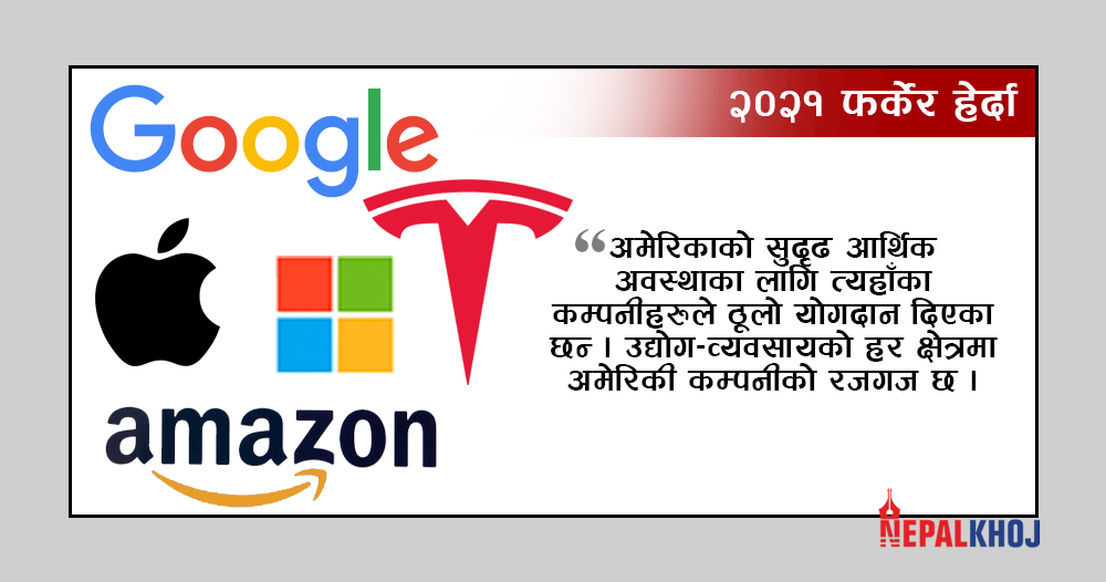 काठमाडौं । अमेरिका संसारको सुपर पावर ह‍ो । यो तागतका पछाडि उसको मजबुत अर्थव्यवस्था आधारका रुपमा खडा छ । अमेरिकाको यो सुदृढ आर्थिक अवस्थाका लागि अमेरिकी कम्पनीहरुले ठूलो योगदान दिएका छन् । उद्योग-व्यवसायको हर क्षेत्रमा अमेरिकी कम्पनीको रजगज छ । यी अमेरिकी कम्पनीहरुको कारोबार संसारभर फैलिएको छ । आउनुहोस् हेरौं २०२१ मा संसारभर राज गर्न सफल पाँच ठूला कम्पनीको कथा :