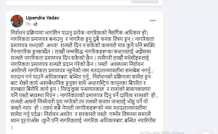 आइतबार सामाजिक सञ्जालमार्फत उमेर पुगेका तर नागरिकता नभएकाहरु निर्वाचन प्रक्रियामा सहभागि हुनुपर्ने यादवले बताए । उनले लेखेका छन्, –‘नागरिकता प्रमाणपत्र नभएको अथवा राज्यले दिन नसकेको कारणले मात्र कुनै पनि व्यक्ति गैरनागरिक हुन सक्दैन । लाखौँ जन्मसिद्ध नागरिकहरूका सन्तानलाई अझैसम्म राज्यले नागरिकता प्रमाणपत्र दिन सकेको छैन । त्यसैगरी लाखौं मधेसीहरूलाई नागरिकता प्रमाणपत्र राज्यले प्रदान गरेको छैन ।’
