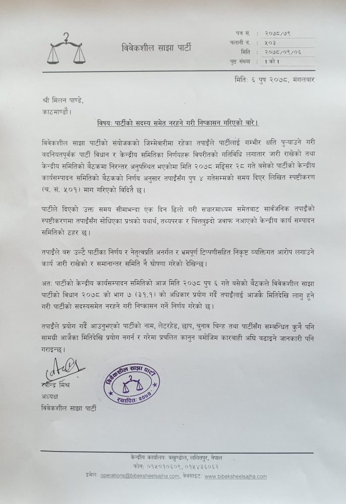 पत्रमा पाण्डेले प्रयोग गर्दै आएको पार्टीको नाम, लेटरहेड, छाप, चुनाव चिन्ह तथा पार्टीसँग सम्बन्धित कुनै पनि सामग्री प्रयोग नगर्न र गरेमा प्रचलित कानुन बमोजिम कारबाही अघि बढाइने चेतावनीसमेत दिइएको छ ।