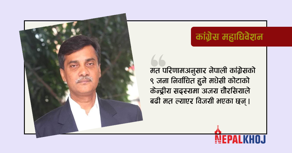काठमाडौं । नेपाली कांग्रेसको मधेसी कोटाको केन्द्रीय सदस्यमा अजय चौरसियाले बढी मत ल्याएका छन् । आज आएको मत परिणामअनुसार ९ जना निर्वाचित हुने यो कोटामा चौरसियाले सबैभन्दा बढी मत ल्याएका हुन् ।