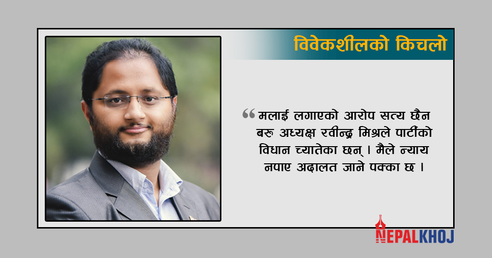 काठमाडौँ । विवेकशील साझा पार्टीका निष्कासित संयोजक मिलन पाण्डेले आफूलाई गरेको कारबाही अवैधानिक भएको बताएका छन् । आज अध्यक्ष रविन्द्र मिश्रले पार्टीको बैठकबाट साधारण सदस्य समेत नरह्ने गरि गरेको कारबाहीमा पाण्डेको प्रतिक्रिया आएको हो ।