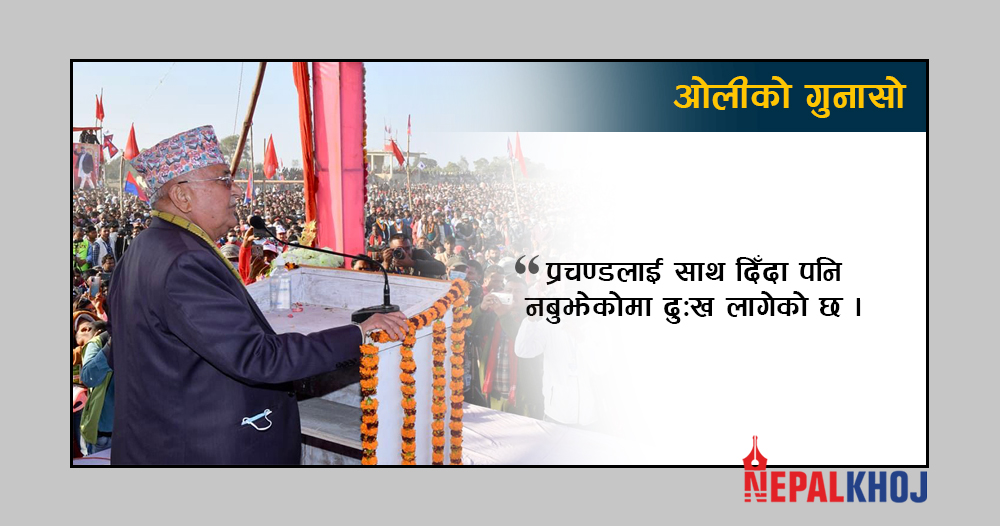 काठमाडौं । नेकपा एमालेका अध्यक्ष केपी शर्मा ओलीले माओवादी केन्द्रका अध्यक्ष पुष्पकमल दाहाललाई हात दिएर सहयोग गरेको बताएका छन । आज पर्साको जनसभामा ओलीले प्रचण्डलाई साथ दिँदा पनि नबुझेकोमा दुख लागेको बताए ।