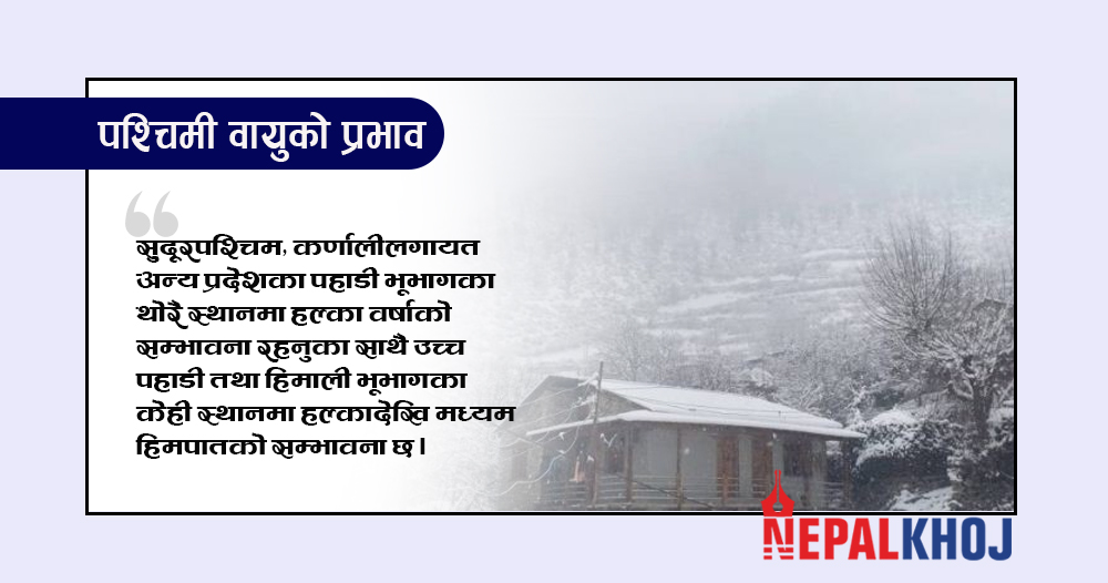मौसम पूर्वानुमान महाशाखाले देशका उच्च पहाडी तथा हिमाली क्षेत्रका केही स्थानमा हल्का हिमपातको सम्भावना रहेको तथा देशका पहाडी भूभागका एक वा दुई स्थानमा हल्का वर्षाको सम्भावना रहेको र तराईका भूभागमा बिहानको समयमा हुस्सु/कुहिरो लाग्नाका साथै देशभर चिसो बढ्नेक्रम रहेकाले चिसोबाट बच्न आवश्यक सुरक्षा एवं सतर्कता अपनाउनसमेत सबैमा अनुरोध गरेको छ ।