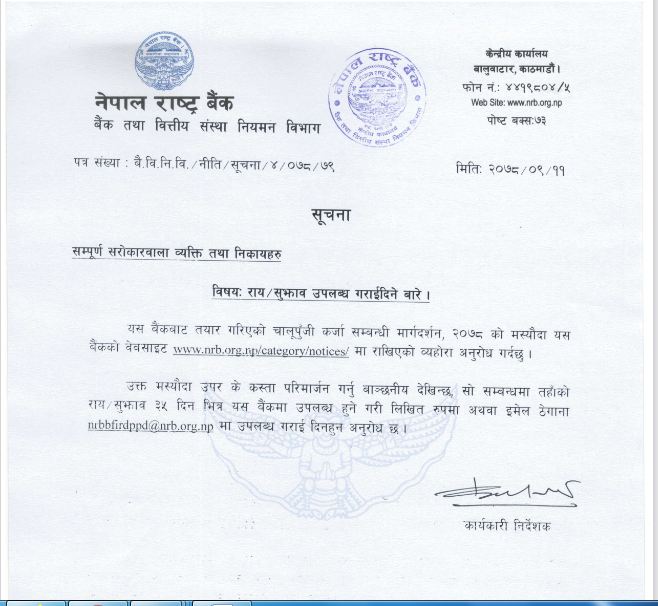 चालु पूँजी कर्जासम्बन्धी मार्गदर्शन २०७८ मा सुझाव दिन माग