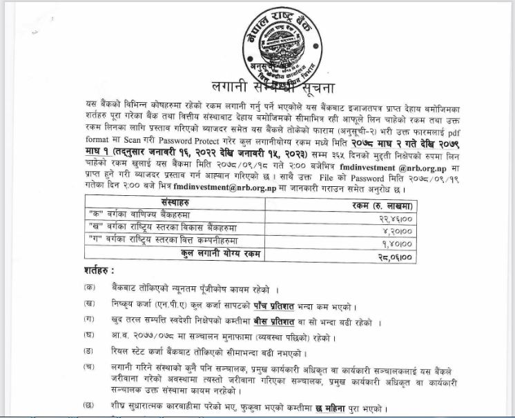 रकम लगानीको लागि प्रस्ताव पेस गर्ने बैंक तथा फाईनान्स कम्पनीहरु सञ्चालनमा आएको कम्तीमा दुई वर्ष पुरा गरेको, तोकिएको न्यूनतम पूँजीकोष कायम रहेको, निष्कृय कर्जा (एन.पी.ए) कुल कर्जा सापटको पाँच प्रतिशत भन्दा कम भएको खुद तरल सम्पत्ति स्वदेशी निक्षेपको कम्तिमा २० प्रतिशत वा सो भन्दा बढी रहेको हुनु पर्ने प्रावधानहरु तोकिएका छन् ।