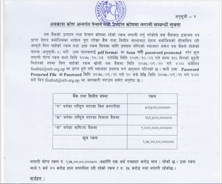यसरी मुद्धती निक्षेपको रुपमा राखिने कुल रकम मध्येमा वाणिज्य बैंकहरुको लागि एक अर्ब ४० करोड, विकास बैंकहरुको लागि २६ करोड २५ लाख र फाईनान्स कम्पनीहरुको लागि आठ करोड ७५ लाख रुपैयाँ छुट्याईएको छ । राष्ट्र बैंकका अनुसार रकम लगानी गर्न चाहाने इच्छुक तथा फाईनान्स कम्पनीहरुले यही पुस २० गते अपराह्न ४ बजेसम्म नेपाल राष्ट्र बैंकमा आफूले लगानी गर्न चाहेको रकम र उक्त रकममा दिन चाहेको व्याजसमेत उल्लेख गरेर आवेदन दिनुपर्ने छ ।