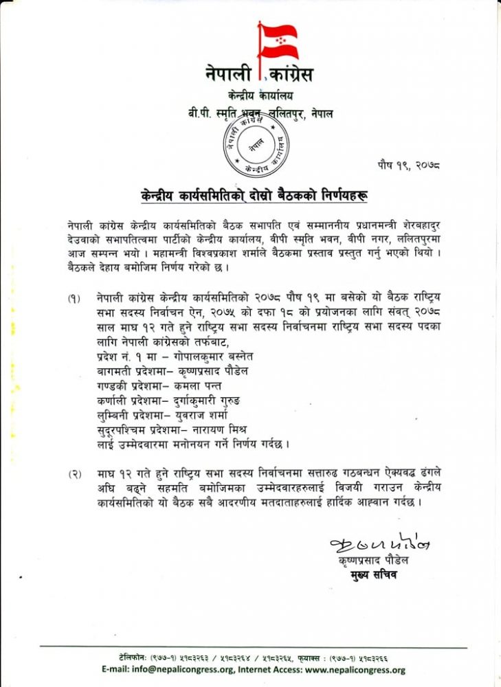 काठमाडौं । नेपाली कांग्रेसले राष्ट्रियसभाका उम्मेदवारहरुको टुंगो लगाएको छ ।
