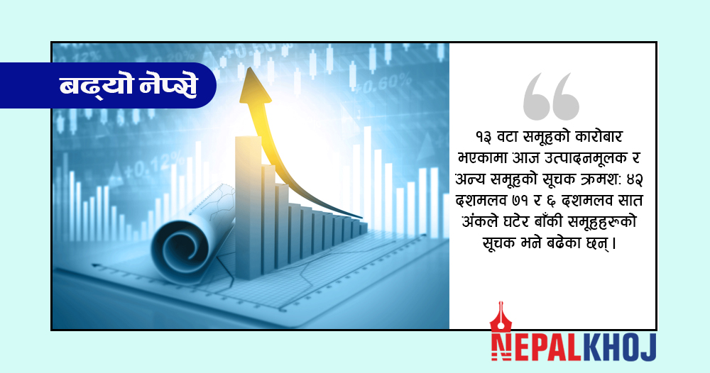 १३ वटा समूहहरुको कारोबार भएकोमा आज उत्पादनमुलक र अन्य समूहको सूचक व्रmमश ४२ दशमलव ७१ र छ दशमलव सात अंकले घटेर बाँकी समूहहरुको सूचक भने बढेका छन् । सो मध्ये वाणिज्य बैंक समूहको सूचक ६३ दशमलव ६७ अंकले बढेर १८ सय २५ दशमलव १३ अंकमा चढेकोमा विकास बैंक समूहको सूचक पनि दुई सय ३२ दशमलव ४१ अंकले बढेर ४६ सय ७५ दशमलव ३१ अंकमा चढेको छ ।