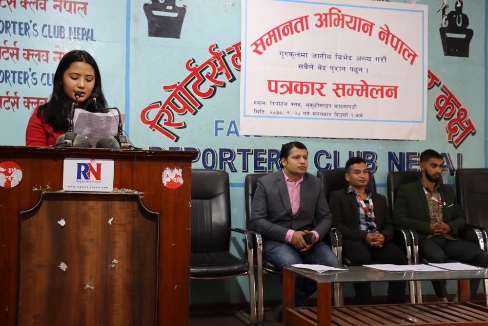 काठमाडौं । समानता अभियान नेपालले दलितलगायतका सबै समुदायका मानिसले गुरुकुलमा अध्ययन गर्न पाउने व्यवस्था गर्न माग गरेको छ । आज रपोर्टर्स क्लब नेपालमा पत्रकार सम्मेलन गर्दै अभियानले देशभरका संस्कृत गुरुकुलमा दलित, आदिवासी, जनजाति, खस क्षेत्रीलगायत सबै जातजातिहरुलाई गुरुकुलमा पढ्न पाउने अधिकार सुनिश्चित् गर्न सरकारसँग माग गरेको हो ।