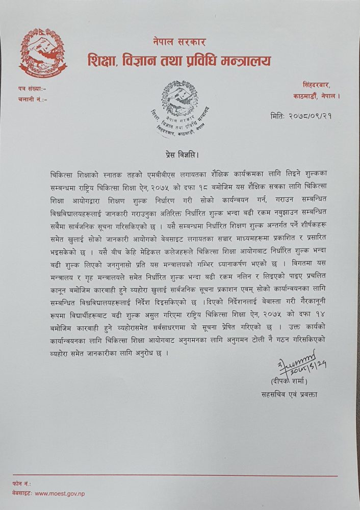बुधबार मन्त्रायलका प्रवक्ता दीपक शर्माद्वारा जारी विज्ञप्तिमा भनिएको छ, ‘दिएको निर्देशनलाई बेवास्ता गरी गैरकाकुनी रुपमा विद्यार्थीबाट बढी शुल्क असुर गरिएमा राष्ट्रिय चिकित्सा शिक्षा ऐन, २०७५ को दफा १४ बमोजिम कारबाही हुने व्यहोरा सूचित गरिन्छ ।’