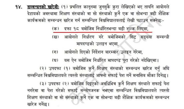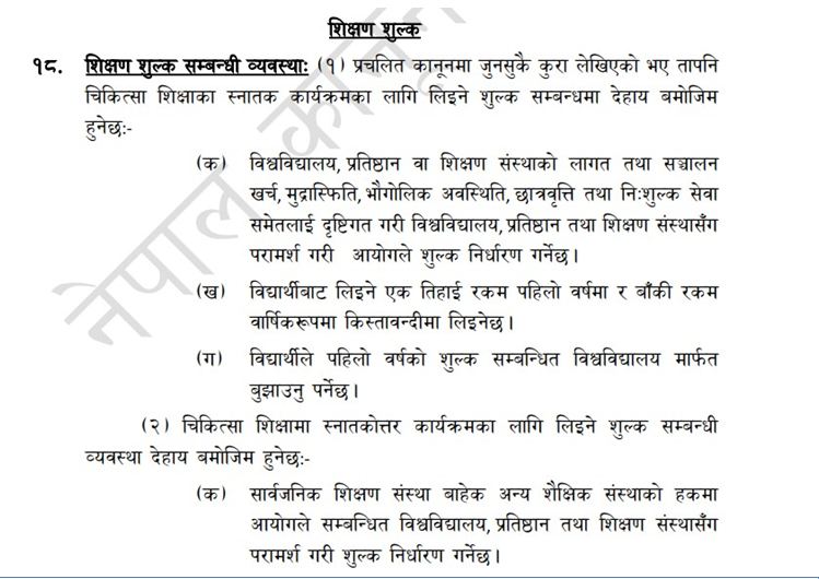 राष्ट्रिय चिकित्सा शिक्षा ऐन, २०७५ को दफा १४ (क)मा निर्धारितभन्दा बढी शुल्क लिएमा सम्बन्धनको खारेजी गर्ने उल्लेख छ । विगतमा शिक्षा र गृह मन्त्रालयले समेत निर्धारित शुल्कभन्दला बढी रकम नलिन र लिइएको पाइए प्रचलित कानूनबमोजिम कारबाही भन्दै सम्बन्धित विश्वविद्यालयहरूलाई निर्देशन दिइसकेको शिक्षा, विज्ञान तथा प्रविधि मन्त्री देवेन्द्र पौडेलले जानकारी दिएका छन् ।
