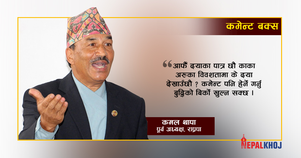 राष्ट्रिय प्रजातन्त्र पार्टीका पूर्व अध्यक्ष कमल थापा लेख्छन् : विगतको विषम् परिस्थितिमा मैले राजसंस्थाको एजेन्डा बोक्दा प्रतिगामी, पुनरोत्थानवादी र ‘सिनो’बोकेर हिँड्ने भनेर मलाई सत्तोसराप गर्नेहरु नै अहिले मैले राजा राजनीतिभन्दा माथि रहनुपर्छ, पार्टीमा चलखेल गर्नुहुँदैन भन्दा मेरो खेदो खनिरहेका छन्, हाँसो र उदेक लाग्छ । त्यो राजतन्त्रप्रति विकसित नयाँ मोह हो वा मेरो चरित्रहत्या गर्ने रहर, मैले बुझ्न सकेको छैन । म निरंकुश र सक्रिय राजतन्त्रको पक्षमा छैन । राप्रपाको आन्तरिक प्रतिस्पर्धामा निर्मल निवासको नांगो हस्तक्षेपबाट राजा निष्पक्ष अभिभावक र राजनीतिभन्दा माथि बस्न नचाहने स्पष्ट संकेत मिलेको छ । मेरो समस्या र पीडा त्यही हो । यो प्रसंगलाई हारजितसँग जोडेर हेर्नेहरुले समस्याको जडलाई बुझ्न सक्दैनन् । उनीहरुको विवशता प्रति मेरो दया छ । तर, स्पष्ट होस्-विचार मिलेन भने पार्टीबाट कुनै दिन नैतिक आधारमा म अलग हुनसक्छु तर राप्रपा कदापि फुटाउने छैन । थापाको यो टिप्पणीमा आएका प्रतिक्रियाहरु कमेन्ट बक्सबाट :