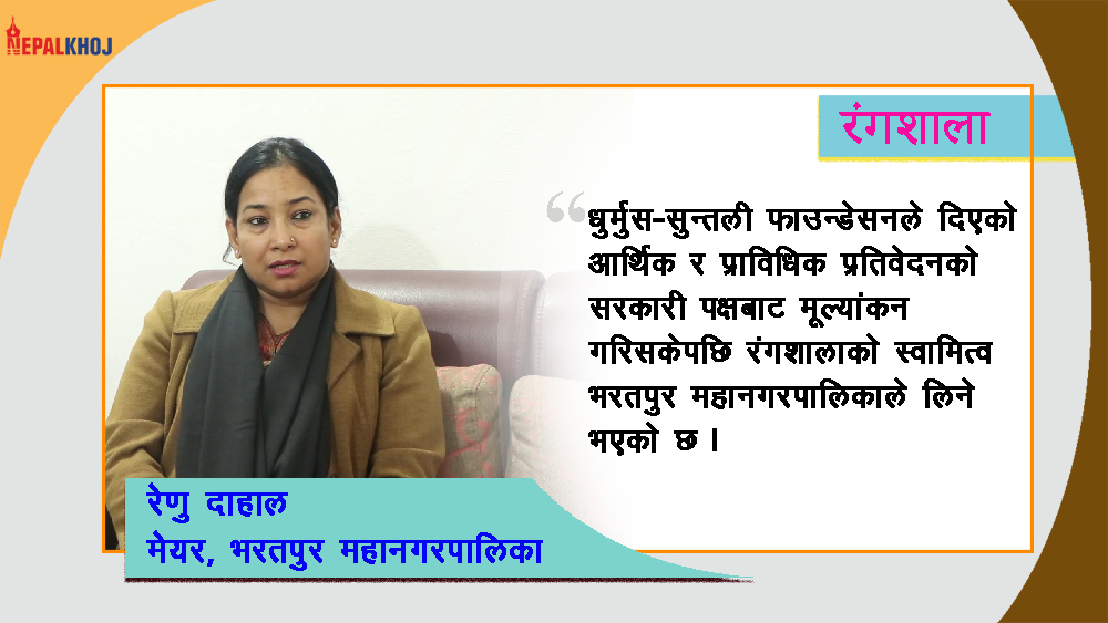 न्यूज एजेन्सी नेपालसँग आज (आइतबार) भरतपुरमा महानगरपालिकाको कार्यालयमा कुरा गर्दै मेयर दहालले धुर्मुस–सुन्तली फाउन्डेशनले आफूलाई १७ करोड ऋण लागिसकेको र राष्ट्रिय तथा अन्तर्राष्ट्रिय स्तरबाट पनि सोचेअनुरुपको सहयोग प्राप्त नभएकोले महानगरलाई स्वामित्व लिन आग्रह गरेको र महानगरले अब रंगशालाको लागि काम अघि बढाउने जनाइन् ।