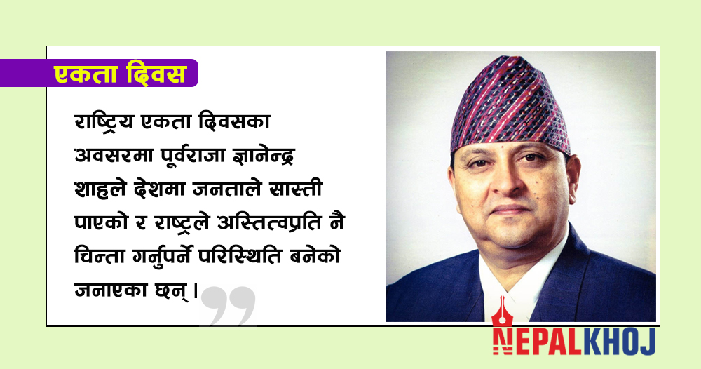 दिवसको अवसरमा पूर्वराजा शाहले देशमा जनताले सास्ती पाएको र राष्ट्रले अस्तित्वप्रति नै चिन्ता गर्नुपर्ने परिस्थिति बनेको जनाएका छन् । एक विज्ञप्ति जारी गर्दै शाहले अहिलेको तन्त्रमा व्यर्थको अभ्यास गरेर समय बर्बाद गर्न नहुने जनाएका छन् ।