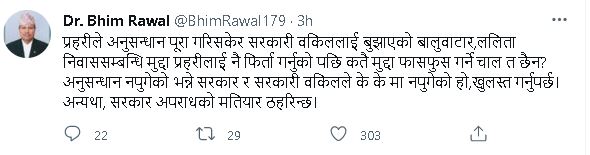 प्रहरीले अनुसन्धान पूरा गरेर सरकारी वकिललाई बुझाएको उक्त जग्गा प्रकरणसम्बन्धी फाइल प्रहरीलाई नै फिर्ता गरिएपछि नेता रावलले आपत्ति जनाएका हुन् । रावलले लेखेका छन्, ‘प्रहरीले अनुसन्धान पूरा गरिसकेर सरकारी वकिललाई बुझाएको बालुवाटार, ललिता निवाससम्बन्धी मुद्दा प्रहरीलाई नै फिर्ता गर्नुको पछि कतै मुद्दा फासफुस गर्ने चाल त छैन ? अनुसन्धान नपुगेको भन्ने सरकार र सरकारी वकिलले के–केमा नपुगेको हो, खुलस्त गर्नुपर्छ । अन्यथा, सरकार अपराधको मतियार ठहरिन्छ ।’