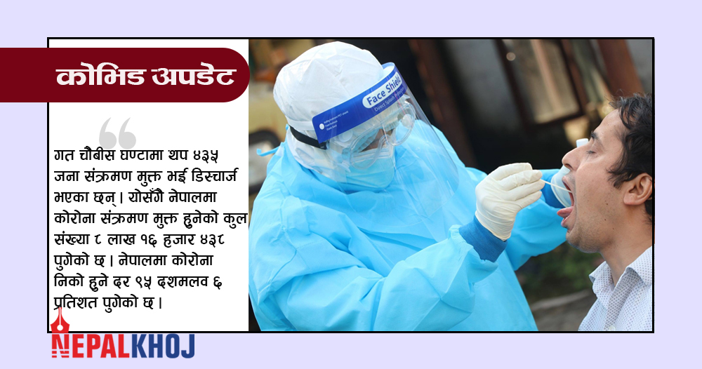 त्यस्तै, नेपालमा गत चौबीस घण्टामा थप ४३५ जना संक्रमण मुक्त भइ डिस्चार्ज भएका छन् । योसँगै नेपालमा कोरोना संक्रमण मुक्त हुनेको कुल संख्या ८ लाख १६ हजार ४३८ पुगेको छ । नेपालमा कोरोना निको हुने दर ९५ दशमलव ६ प्रतिशत पुगेको छ ।
