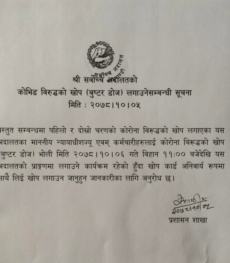 सर्वोच्चले सूचना जारी गरेर आज बिहान ११ बजेदेखि अदालत परिसरमा पहिलो र दोस्रो डोज लगाएका न्यायाधीश र कर्मचारीलाई कोरोनाविरुद्धको बुस्टर डोज लगाउने जनाएको हो ।