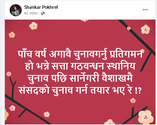 पोखरेलकाे प्रश्न- एमालेले गर्दा प्रतिगमन अब गठबन्धनले बैशाखमै संघीय चुनाव गर्दा के ?
