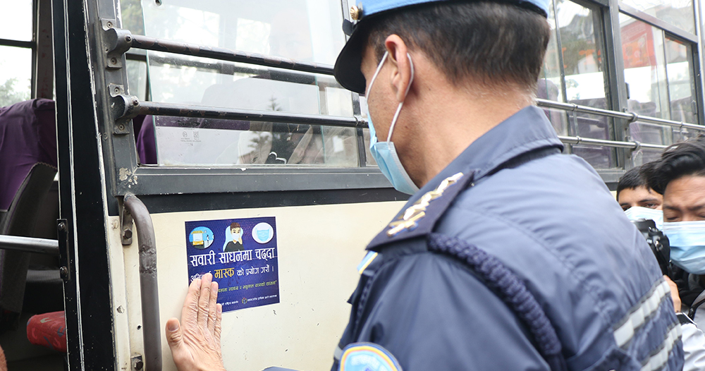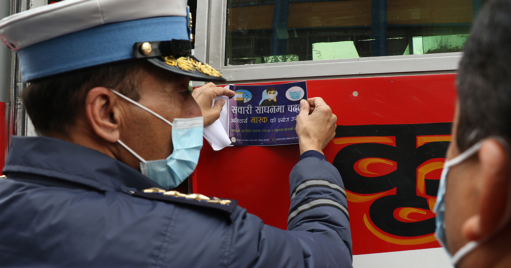 ट्राफिक प्रहरीले सवारी साधनमा यात्रा गर्दा मास्कको प्रयोग भए–नभएको अनुगमन गर्दै मास्क नलगाएको पाइए सम्झाई–बुझाइ गरि मास्क समेत बितरण गरेको छ । स्व–स्फुर्त रुपमा मास्कको प्रयोग गर्ने चालक सह–चालक तथा यात्रुलाई सचेतना अभिबृद्धि गर्न ट्राफिक प्रहरीले अनुरोध गरेको छ । उपत्यकामा चल्ने सार्वजनिक सवारी साधनमा ‘सवारी साधनमा चढ्दा अनिवार्य मास्कको प्रयोग गरौं’ भन्दै पन्ध्र हजार स्टिकर टाँस गरिएको हो । अभियानले सम्पुर्ण सडक प्रयोगकर्ता आम सर्वसाधरणलाई मास्कको अनिवार्य प्रयोग गर्नुपर्छ भन्ने कुरालाई स्मरण गराउने र मास्कको प्रयोग नगरेकालाई लगाउन प्रेरित समेत गर्ने महाशाखाको बुझाई छ । ट्राफिक प्रहरीले अनिवार्य मास्कको प्रयोग गर्न अनुगमन गर्ने, सचेतना जगाउने र मास्क वितरण समेत गर्दै आएको छ ।
