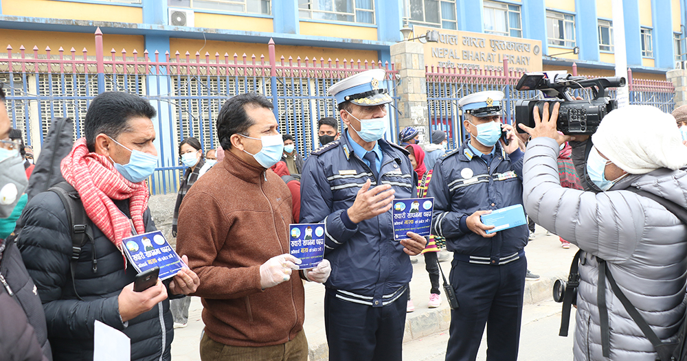 काठमाडौं मल अगाडी गरिएको कार्यक्रममा ट्राफिक प्रहरी महाशाखाका प्रमुख बरिष्ठ उपरीक्षक उमेशराज जोशी, यातायात व्यवसायी तथा पदाधिकारी र अन्य प्रहरी अधिकृतहरुको उपस्थितिमा ‘सवारी साधनमा चढ्दा अनिवार्य मास्कको प्रयोग गरौं’ भन्ने सचेतनायुक्त स्टिकर टाँस गरिएको हो । कार्यक्रममा एसएसपी जोशीले कोरोना संक्रमणको रोकथाम तथा नियन्त्रण गर्न अपनाउनु पर्ने स्वास्थ्य मापदण्ड र सावधानीका उपायहरुलाई पूर्ण पालना गर्न अनुरोध गरे । उनले ’ट्राफिक प्रहरीको चाहना, स्वस्थ र सकुशल यात्राको कामना’ भन्ने मूल अभिप्रायका साथ सुुरु गरिएको सचेतना अभियानले संक्रमण नियन्त्रणमा महत्वपुर्ण भूमिका खेल्ने विश्वास व्यक्त गरे ।