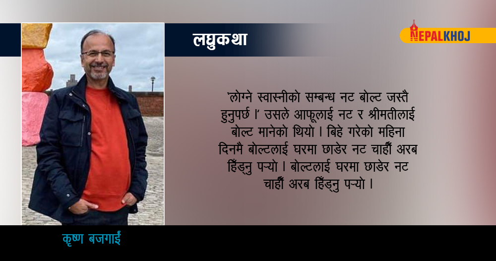 ‘लोग्ने स्वास्नीको सम्बन्ध नट बोल्ट जस्तै हुनुपर्दछ ।’ उसले विवाहमा पाएको आशिर्वादरुपी उपदेशको सोही वाक्य परदेशमा सम्झिरहन्थ्यो । आफूलाई नट र श्रीमतीलाई बोल्ट मानेको थियो । बिहे गरेको महिना दिनमै बोल्टलाई घरमा छाडेर नट चाहीँ अरब हिँड्नु पर्यो ।