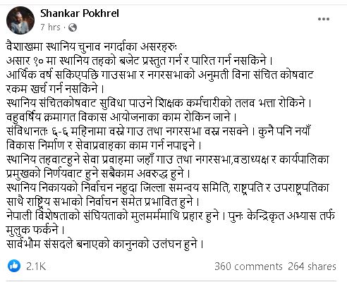 सत्ता गठबन्धनले आगामी मंसिरमा एकैपटक तीनै तहको निर्वाचन गर्नेबारे छलफल चलाइरहेको बेलामा महासचिव पोखरेलले वैशाखमै स्थानीय तहको निर्वाचन गर्नुपर्ने बताएका हुन् । वैशाखमै स्थानीय तहको निर्वाचन नहुँदा त्यसबाट पर्ने विभिन्न असरलाई उनले बुँदागत रूपमा उल्लेख गरेका छन् ।