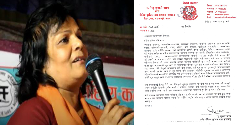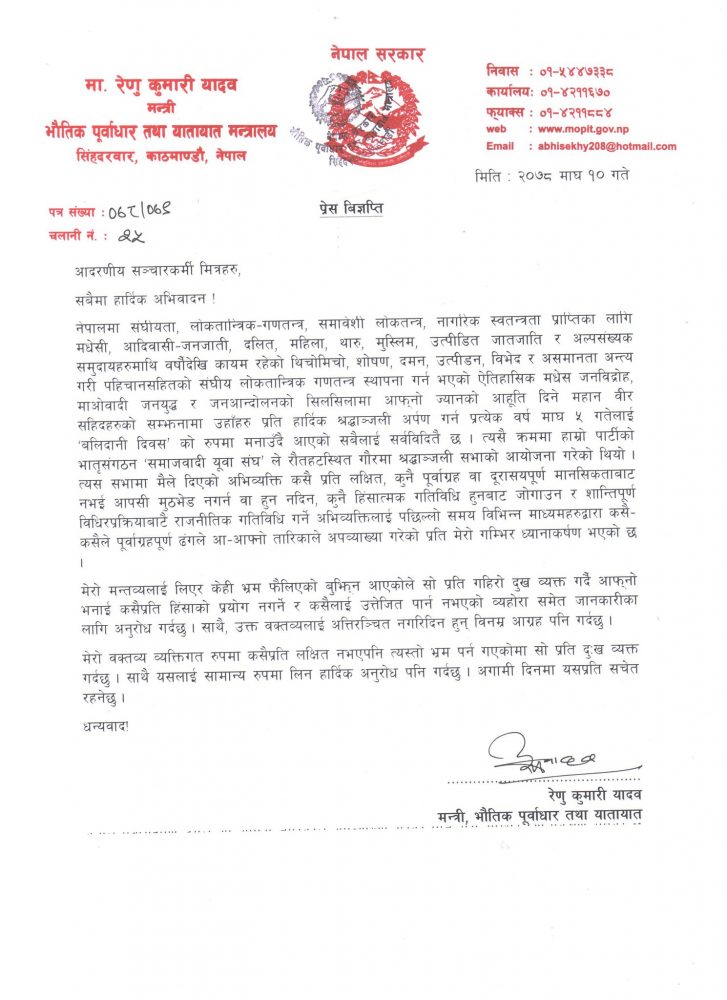 काठमाडौं । जनमत पार्टीका अध्यक्ष सीके राउतलाई ज्यान मार्ने धम्की दिएपछि विवादमा परेकी भौतिक पूर्वाधारमन्त्री रेणु यादवले आफ्नो बचाउ गरेकी छन् । सोमबार विज्ञप्ति जारी गर्दै उनले बचाउ गरिन् ।