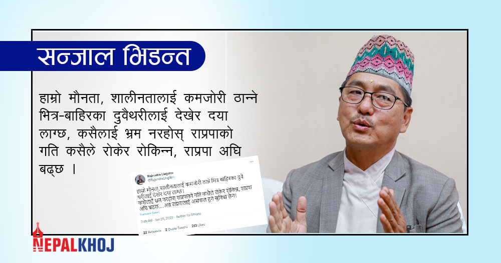 ‘हाम्रो मौनता, शालीनतालाई कमजोरी ठान्ने भित्र-बाहिरका दुवैथरीलाई देखेर दया लाग्छ,’ उनले ट्विटरमा भनेका छन्, ‘कसैलाई भ्रम नरहोस् राप्रपाको गति कसैले रोकेर रोकिन्न, राप्रपा अघि बढ्छ ।’ उनले अब राप्रपालाई असफल हुने सुविधा नभएको पनि बताएका छन् ।